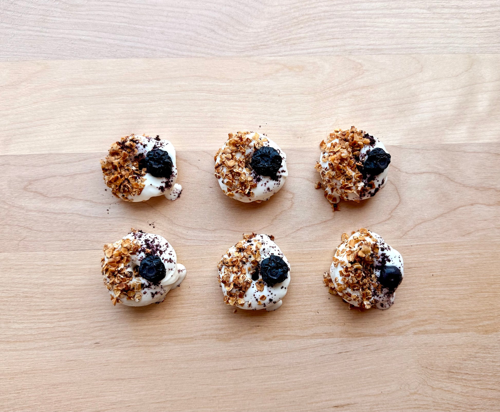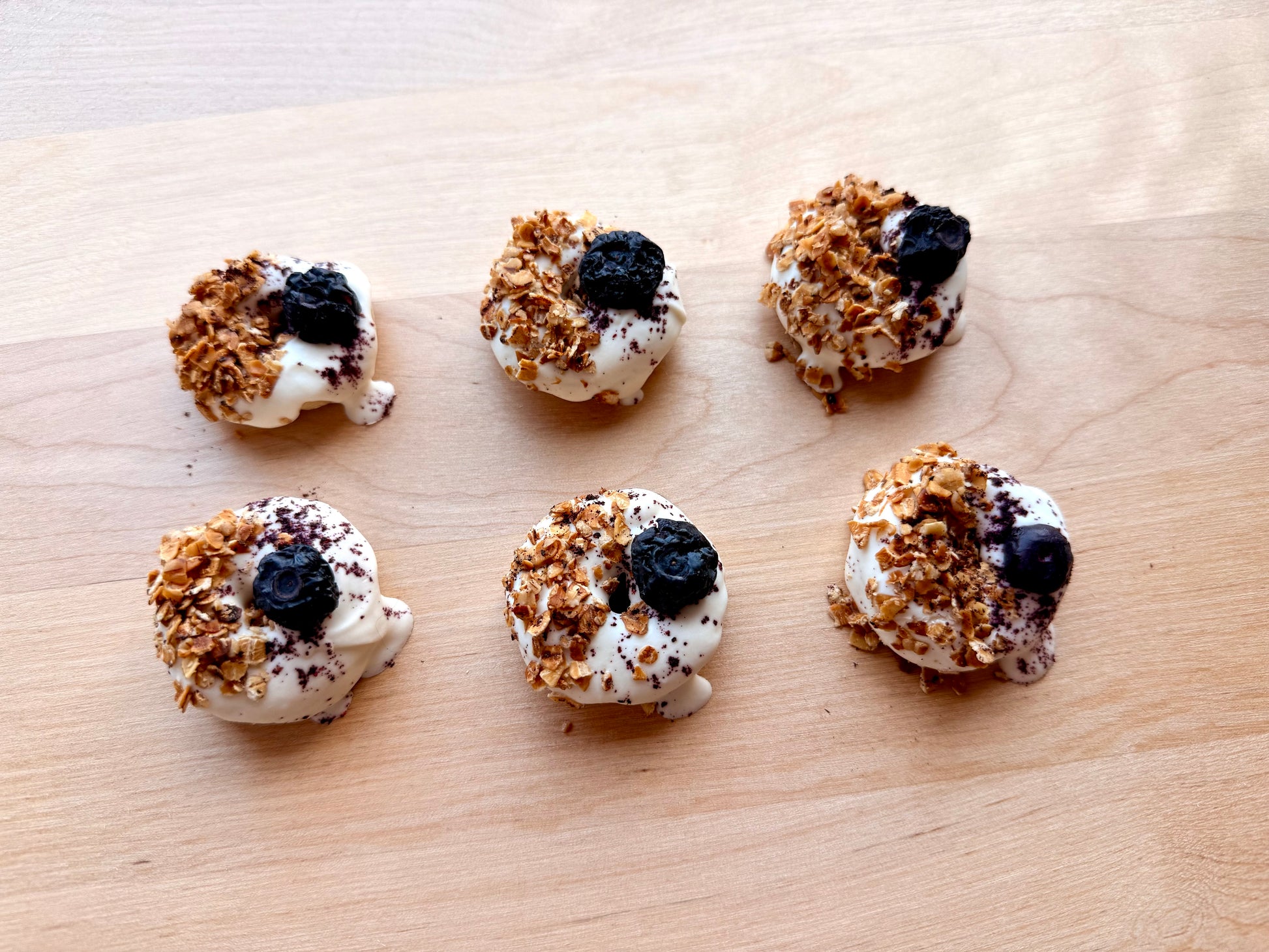 These bite-sized doughnuts are packed with flavour and nutrition in every crunchy swirl. Made with real apples, blueberries, granola, and a touch of coconut oil, each doughnut delivers a blend of natural fiber, antioxidants, and healthy fats to support your pup’s well-being. The soft crunch of baked granola gives them a satisfying texture, while the drizzle of dog-safe yogurt icing adds just the right touch of indulgence—without going overboard.