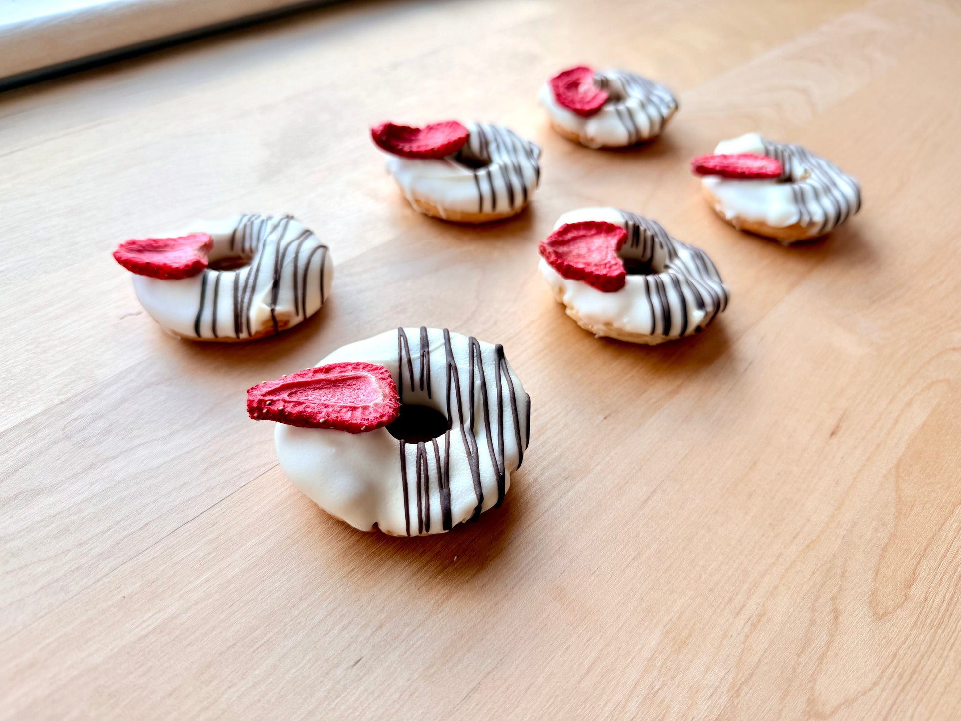 Inspired by the classic Valentine’s dessert, our Chocolate Covered Strawberry Doughnuts are made with a strawberry-based dough and finished with a strawberry and carob drizzle to recreate the look of chocolate-dipped strawberries. This doughnut combines fruity flavour with a rich finish. Available for limited time only.