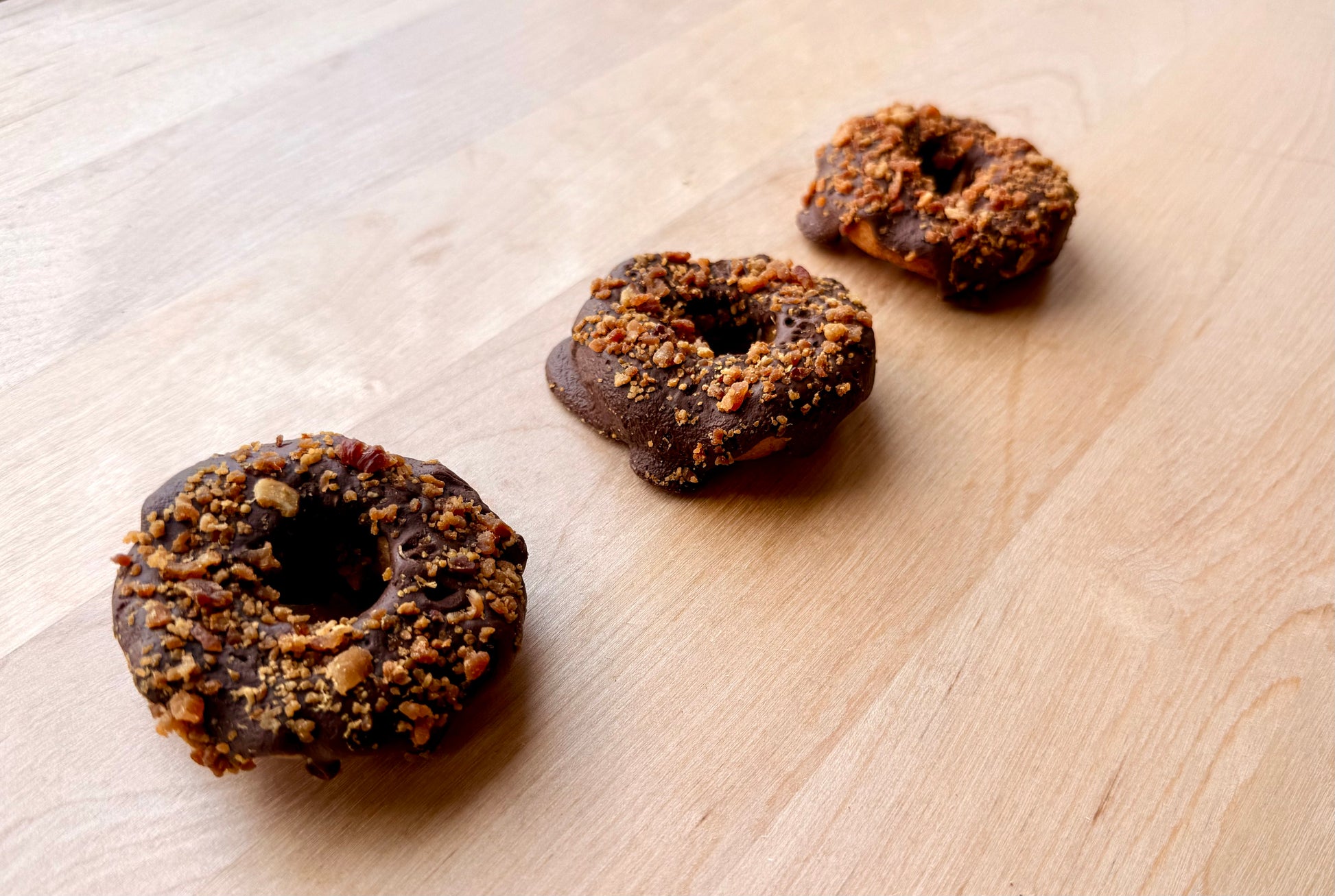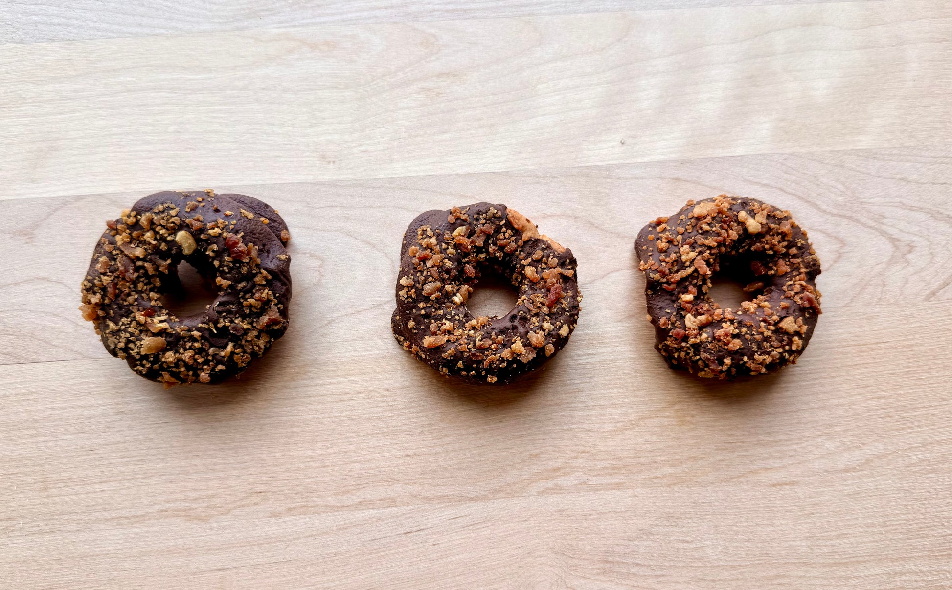 Meet the doughnut that started it all! Our Peanut Butter Bacon Doughnuts are a fan favourite and one of our signature best-sellers—for good reason. Baked to perfection and finished with a carob drizzle, these crunchy doughnuts combine the rich flavour of peanut butter with the irresistible taste of real bacon.