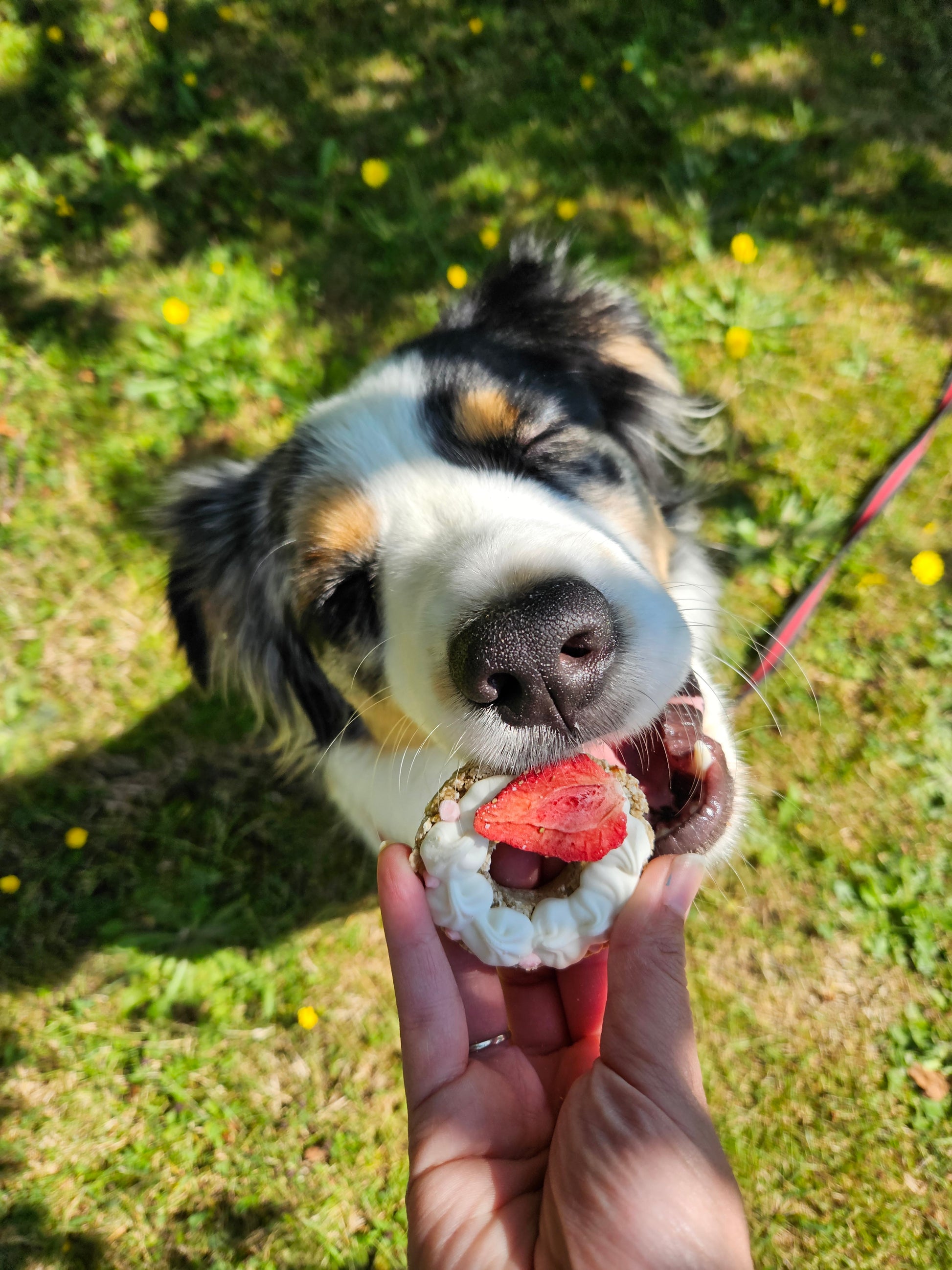 Indulge your pup in the ultimate delight with our Strawberry Cheesecake Doughnuts! This special treat is crafted with creamy cottage cheese, offering a rich source of protein and calcium to support strong bones, healthy muscles, and a shiny coat. We’ve swapped the blueberries from our classic recipe for strawberries which are packed with antioxidants and vitamin C to give your dog an immunity boost and promote overall wellness. The tangy sweetness of the strawberries, combined with the irresistible creaminess of cottage cheese, makes this a treat your furry friend will drool over. Each doughnut is baked with love and designed to deliver a paw-fect balance of flavour and nutrition for your pup.