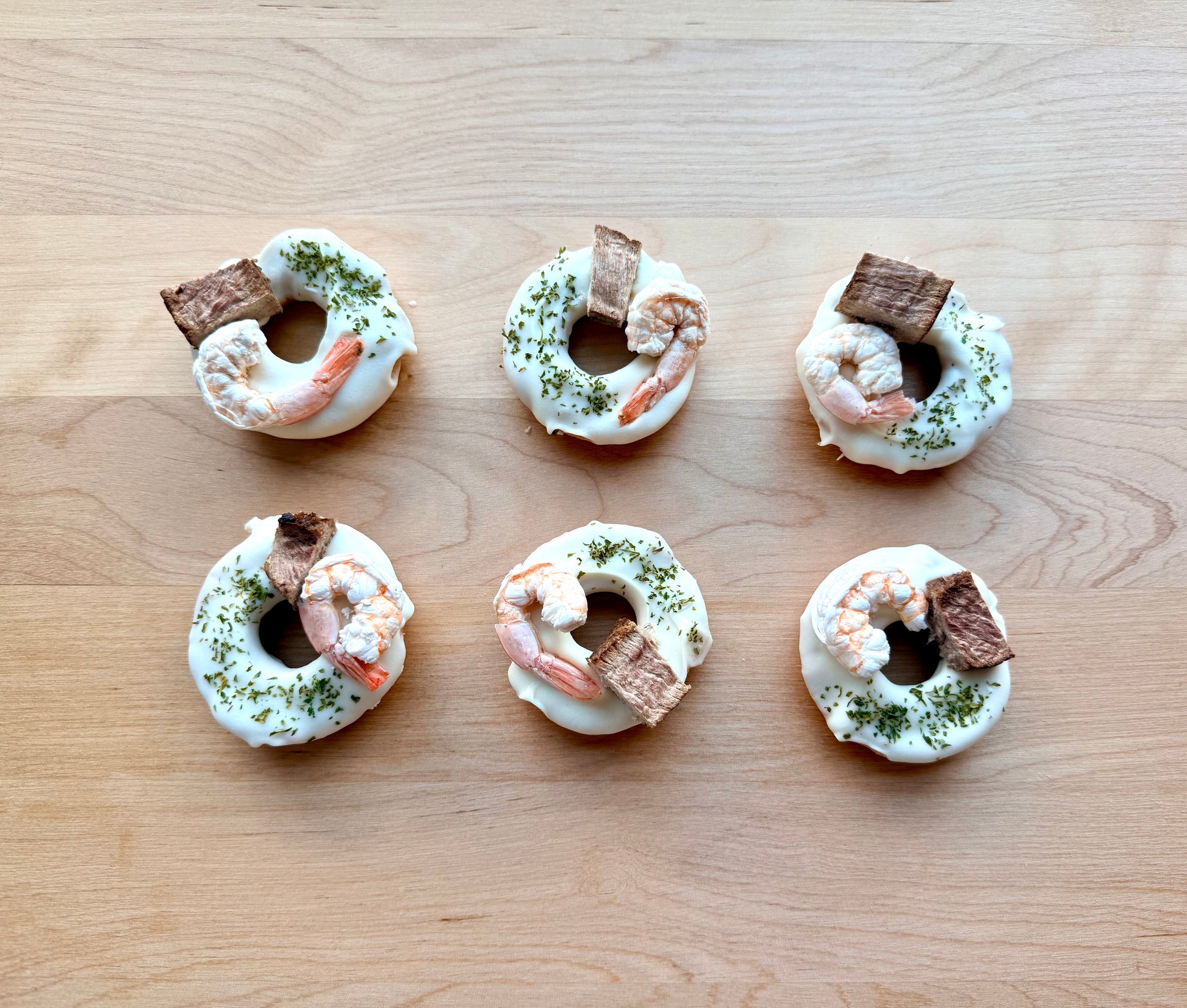 Our Surf & Turf Doughnut is made with a potato-based dough and topped with parsley, steak, and shrimp for a playful take on the classic surf and turf dinner. This savoury doughnut leans into the idea of a special-occasion meal just for your pup!
